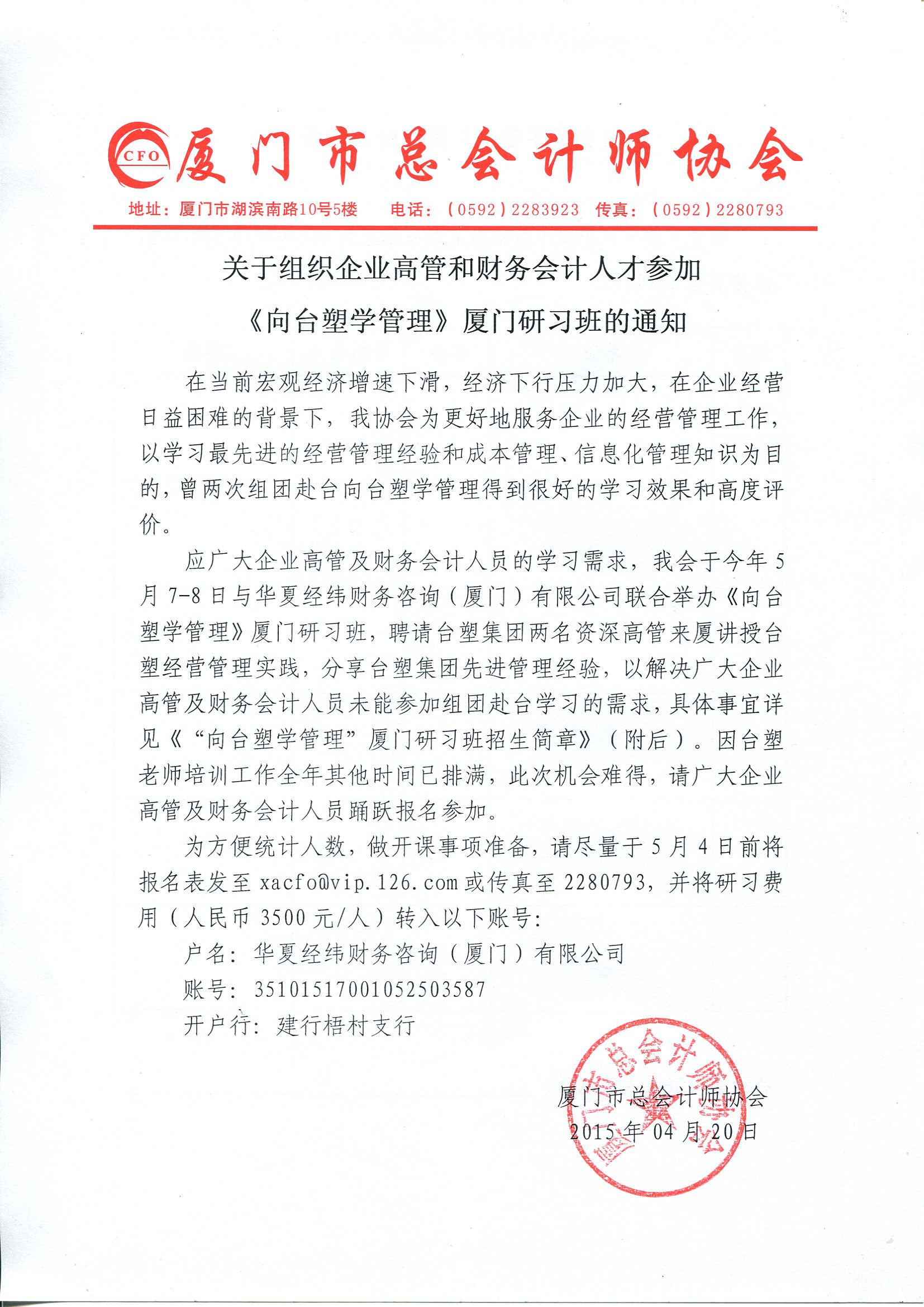 關(guān)于組織企業(yè)高管和財務會計人才參加《向臺塑學管理》廈門研習班的通知