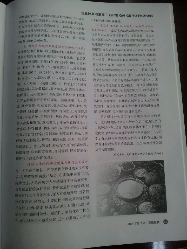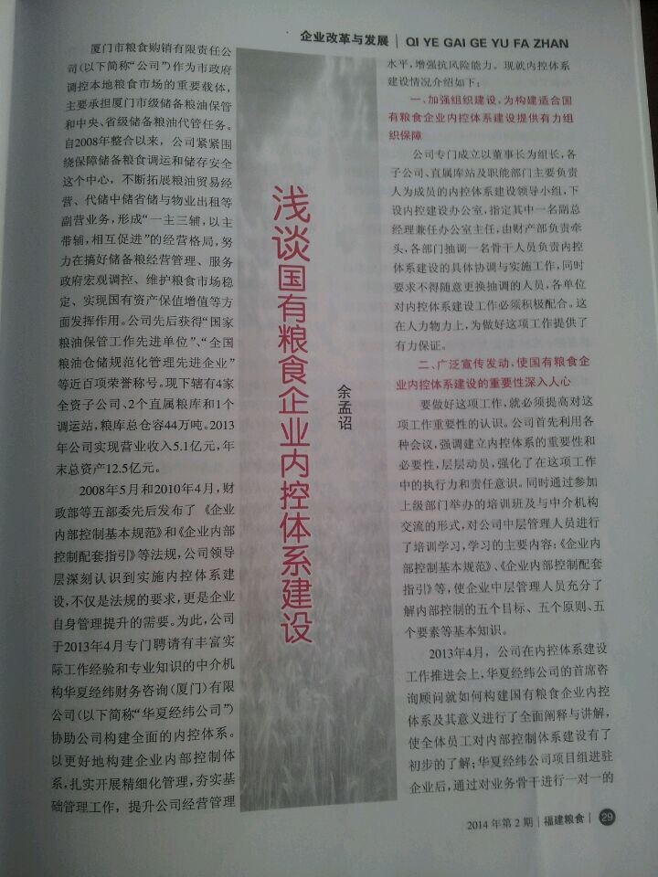 2014年6月份,廈門市糧食購銷有限責(zé)任公司財務(wù)部余孟詔經(jīng)理在由福建省糧食局、福建省糧食行業(yè)協(xié)會聯(lián)合舉辦的刊物《福建糧食》2014年第二期上發(fā)表了《淺談國有糧食企業(yè)內(nèi)控建設(shè)》的文章。文章中闡述了2013年華夏經(jīng)緯財務(wù)咨詢(廈門)有限公司協(xié)助廈門糧食購銷公司建立起了較為完善的內(nèi)部控制體系,為廈門糧食購銷公司的穩(wěn)健持續(xù)發(fā)展提供了優(yōu)良的內(nèi)控環(huán)境。